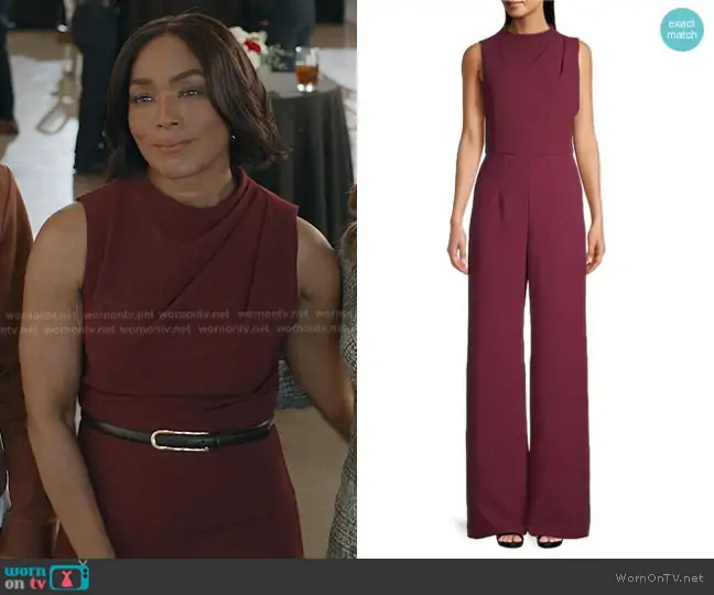 Athena Grant (played by Angela Bassett) on 9-1-1 on ABC was spotted wearing this red gathered jumpsuit on 9-1-1 on episode 'Family History' (9x06) in Nov 2025. Athena's Jumpsuit is the Corinne Sleeveless Flared-Leg Jumpsuit in Maroon by Black Halo.