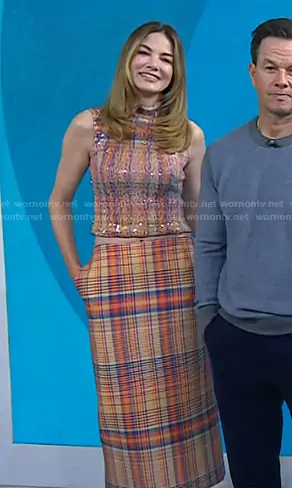 on Today on NBC was spotted wearing this sequin plaid top and skirt on Today on Nov 14 2025's episode. 's Top is the The Piper Paillette Mock Neck Tank Top by Brandon Maxwell . 's Skirt is the The Mercer Bonded Wool-Silk Mikado Pencil Midi Skirt by Brandon Maxwell.