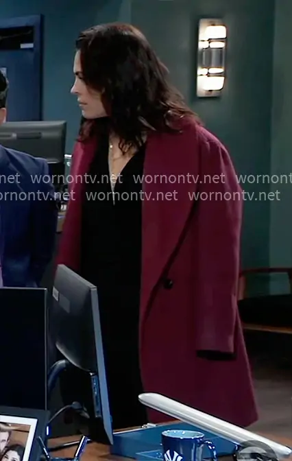 Britt Westbourne (played by Kelly Thiebaud) on General Hospital on ABC was spotted wearing this plum purple coat on General Hospital on Dec 22 2025's episode. Britt's Coat is the Shawl Collar Coat by Avec Les Filles .