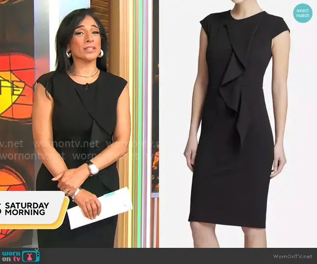 Michelle Miller on CBS Mornings on CBS was spotted wearing this black front ruffle dress on CBS Mornings on Nov 16 2025's episode. Michelle's Dress is the Ruffled Cap Sleeves Sheath Dress by DKNY .