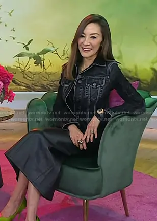 on Today on NBC was spotted wearing this black denim jacket and leather skirt on Today on Nov 17 2025's episode. 's Jacket is the Denim Jacket With Laces by Balenciaga . 's Skirt is the Laced Leather Skirt by Balenciaga . 's Shoes is the Epine Satin Rose Pumps by Roger Vivier.
