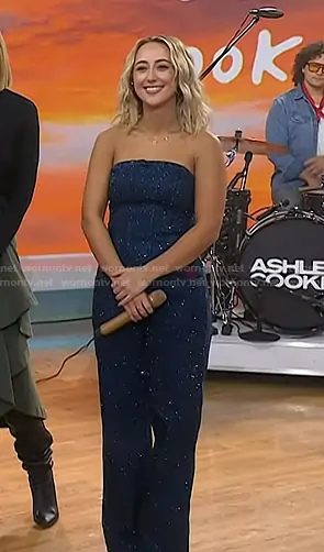 on Today on NBC was spotted wearing this embellished strapless denim top and jeans on Today on Nov 17 2025's episode. 's Top is the Monte Strapless Diamante Denim Corset by Meshki . 's Pants is the Laina Mid Rise Diamante Denim Jeans by Meshki .