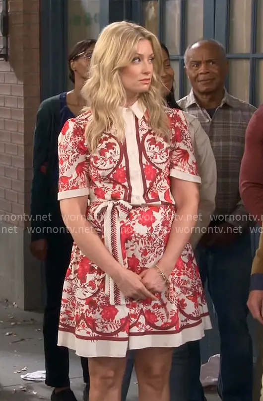 Gemma (played by Beth Behrs) on The Neighborhood on CBS was spotted wearing this red floral shirtdress on The Neighborhood on episode 'Welcome to the Walk of Roses' (8x06) in Nov 2025. Gemma's Dress is the Vacation Print Tie Waist Dress by Rafferiza.
