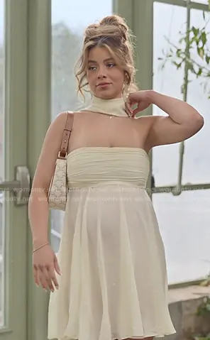 Jen Affleck on The Secret Lives of Mormon Wives on Hulu was spotted wearing this pastel yellow mini dress on The Secret Lives of Mormon Wives on episode 'The Book of Deceit' (3x04) in Nov 2025. Jen's Dress is the Sahar Mini Dress in Pastel Yellow by Seroya . Jen's Bag is the Triomphe Coated Canvas Ava Shoulder Bag by Celine.