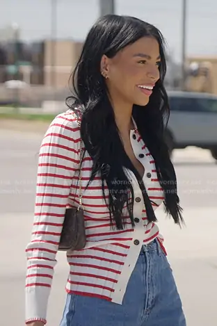 Layla Taylor on The Secret Lives of Mormon Wives on Hulu was spotted wearing this red and white striped cardigan on The Secret Lives of Mormon Wives on episode 'The Book of Deceit' (3x04) in Nov 2025. Layla's Sweater is the Finley Striped Cardigan in white red by Aaron & Amber . Layla's Bag is the Monogram Multi Pochette Accessories Mini Pochette by Louis Vuitton . Layla's Shoes is the Gazelle Bold Shoes by Adidas.