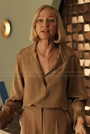 Liberty Ronson (played by Naomi Watts) on Alls Fair on Hulu was spotted wearing this beige collared blouse and pants on Alls Fair on episode 'This Is Me Trying' (1x05) in Nov 2025. Liberty's Top is the Zenzero silk-satin blouse by Max Mara . Liberty's Pants is the Ninfa wool-twill wide-leg pants by Max Mara.