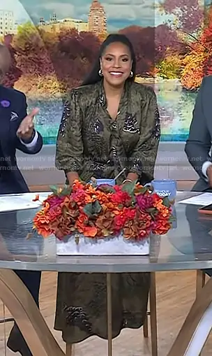 Sheinelle Jones on Today on NBC was spotted wearing this green print tie neck dress on Today on Nov 18 2025's episode. Sheinelle's Dress is the Anora Floral Silk-Blend Tieneck Maxi Dress in Jade Camo by Ronny Kobo.
