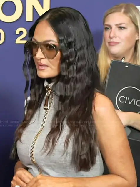 on Access Hollywood on NBC was spotted wearing this gray zip top on Access Hollywood on Nov 18 2025's episode. 's Top is the Zipped Knit Vest by Balmain . 's Pants is the Tailored Cotton Knit Trousers by Balmain . 's Sunglasses is the Navigator-frame Sunglasses by Tom Ford.