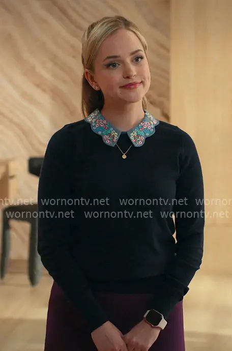 Ainsley (played by Stephanie Styles) on Loot on Apple was spotted wearing this sweater with floral embroidered collar on Loot on episode 'Billionaire, Beautiful and True' (3x07) in Nov 2025. Ainsley's Sweater is the Colette Collar Jumper by Boden.