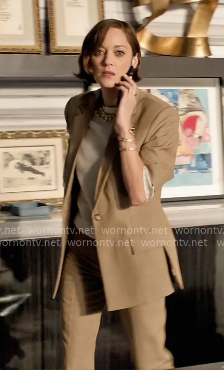 Celine Dumont (played by Marion Cotillard) on The Morning Show on Apple TV was spotted wearing this beige suit on The Morning Show on episode 'Knowing Violation' (4x10) in Nov 2025. Celine's Jacket is the Virgin wool jacket by Victoria Beckham . Celine's Pants is the Cropped flared trousers by Victoria Beckham . Celine's Necklace is the Carlyle™ Necklace by David Yurman.