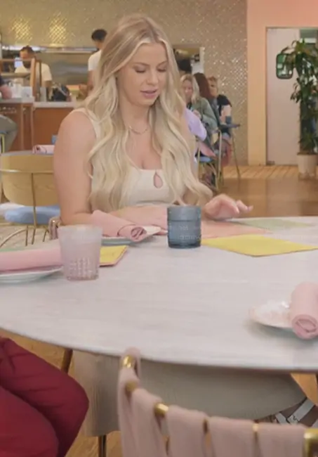 Mayci Neeley on The Secret Lives of Mormon Wives on Hulu was spotted wearing this beige sleeveless dress on The Secret Lives of Mormon Wives on episode 'The Book of Resurrection' (3x05) in Nov 2025. Mayci's Dress is the En Route Knit Cover-Up Maxi Dress by LSpace.