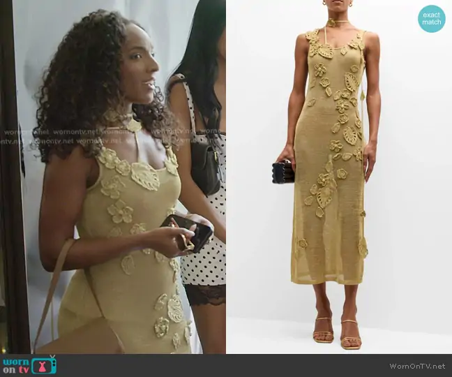 Gabriella Sanon on The Secret Lives of Mormon Wives on Hulu was spotted wearing this yellow floral crochet dress on The Secret Lives of Mormon Wives on episode 'The Book of Confrontation' (3x06) in Nov 2025. 's Dress is the Pemma Crochet-Knit Midi Dress by Cult Gaia.