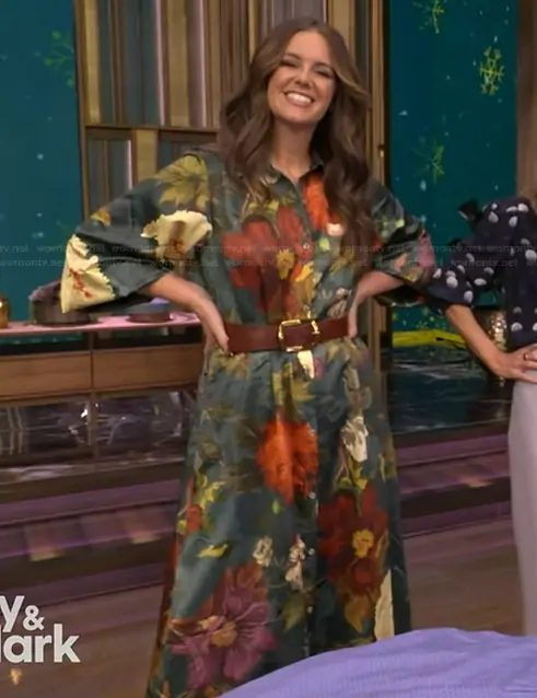 Monica Mangin on Live with Kelly and Mark on Disney ABC Home Entertainment was spotted wearing this green floral shirtdress on Live with Kelly and Mark on Nov 19 2025's episode. Monica's Dress is the The Mona Silky Maxi Shirt Dress by Maeve.