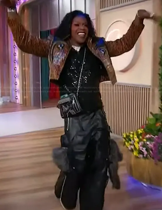 on Sherri on FOX was spotted wearing this leather jacket on Sherri on Nov 18 2025's episode. 's Jacket is the Leopard Print Jacket with Black Faux Leather Applique and Studded Detailing by StartExceedend . 's Bag is the Black PU Leather Bag With Rivets by Hard n Heavy.