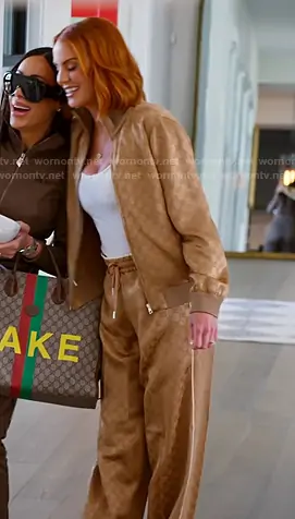 Whitney Rose on The Real Housewives of Salt Lake City on Bravo was spotted wearing this brown satin track jacket and pants on The Real Housewives of Salt Lake City on episode 'The Higher the Hair, the Closer to God' (6x10) in Nov 2025. Whitney's Jacket is the GG Jacquard Satin Blouson by Gucci . Whitney's Pants is the GG Jacquard Satin Wide-leg Pants by Gucci.