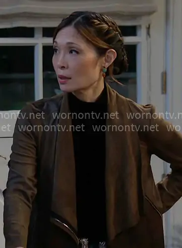 Penelope Poppy Nozawa (played by Romy Park) on The Bold and the Beautiful on CBS was spotted wearing this olive suede draped front jacket on The Bold and the Beautiful on Nov 20 2025's episode. Poppy's Jacket is the Asymmetrical Suede Effect Jacket by Zara .