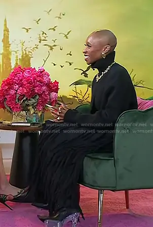 on Today on NBC was spotted wearing this black cutout sweater and tiered skirt on Today on Nov 20 2025's episode. 's Sweater is the Cashmere-Blend Knit Cutout Sweater by Alaia . 's Skirt is the Tiered Wool and Silk Maxi Skirt by Alaia.