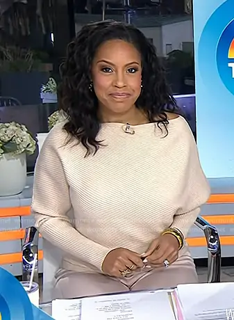Sheinelle Jones on Today on NBC was spotted wearing this Sheinelle’s pink draped ribbed sweater on Today on Jan 27 2026's episode. Sheinelle's Sweater is the Lorna Drape Knitted Top in Oatmeal Neutral by Reiss.