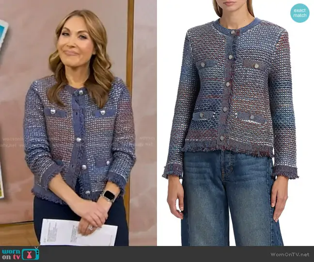 Lara Spencer on Good Morning America on ABC was spotted wearing this white floral embellished dress on Good Morning America on Nov 20 2025's episode. Lara's Dress is the Clyde Dress in le parisien by Alice + Olivia.