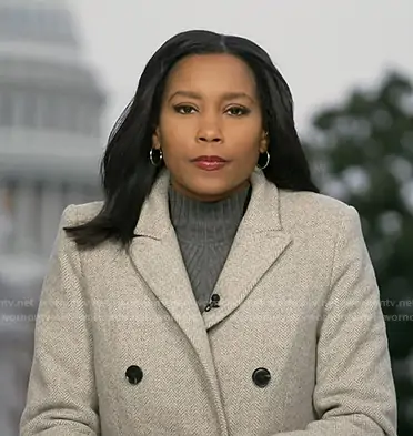 Rachel Scott on Good Morning America on ABC was spotted wearing this grey herringbone coat on Good Morning America on Nov 20 2025's episode. Rachel's Coat is the Herringbone Double-Breasted Coat by Lauren Ralph Lauren.