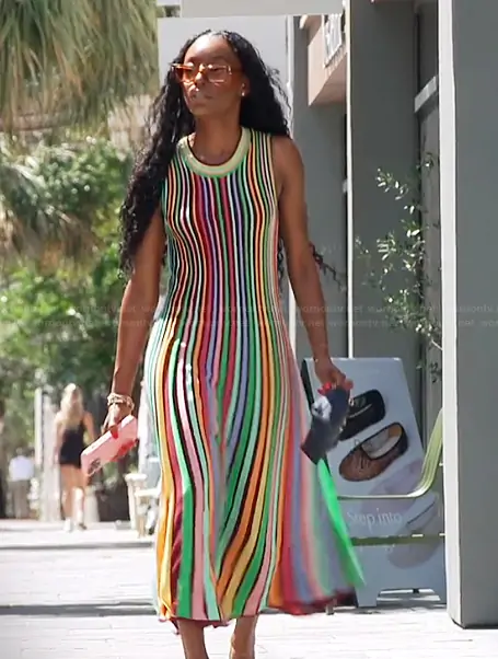 Venita Aspen on Southern Charm on Bravo TV was spotted wearing this rainbow striped dress on Southern Charm on episode 'Single and Ready to Mingle' (11x01) in Nov 2025. Venita's Dress is the Resort Sheath Dress Green Yellow Ribbed Maxi by Tuckernuck . Venita's Sunglasses is the Rivets 53mm Modified Rectangular Sunglasses by Ferragamo . Venita's Bag is the Le Pliage Original Mini Pouch by Longchamp.