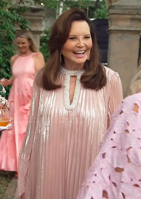 Patricia Altschul on Southern Charm on Bravo TV was spotted wearing this pink metallic maxi dress on Southern Charm on episode 'Single and Ready to Mingle' (11x01) in Nov 2025. 's Dress is the Pink Metallic Pearl Maxi Dress by Self Portrait.