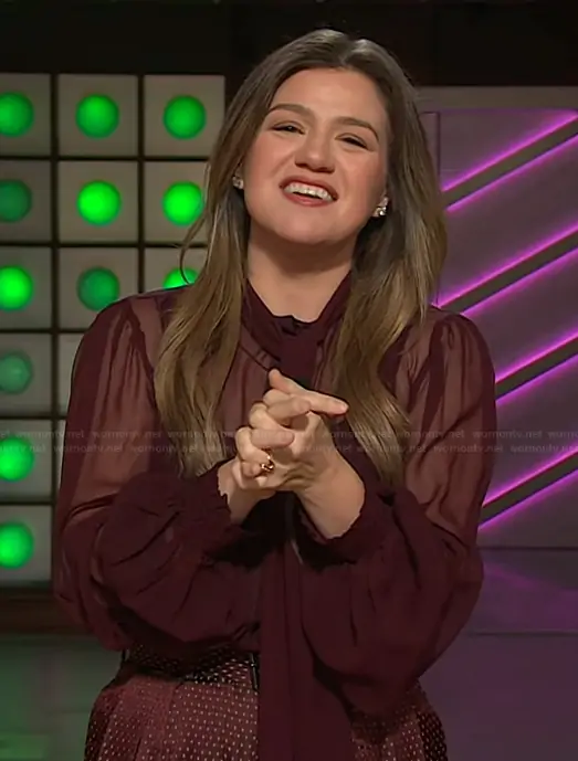Kelly Clarkson on The Kelly Clarkson Show on NBC was spotted wearing this burgundy sheer blouse and pants on The Kelly Clarkson Show on Nov 21 2025's episode. Kelly's Top is the Halsi Top by Retrofete . Kelly's Pants is the Peaches Printed Jacquard Pants by Dries Van Noten.