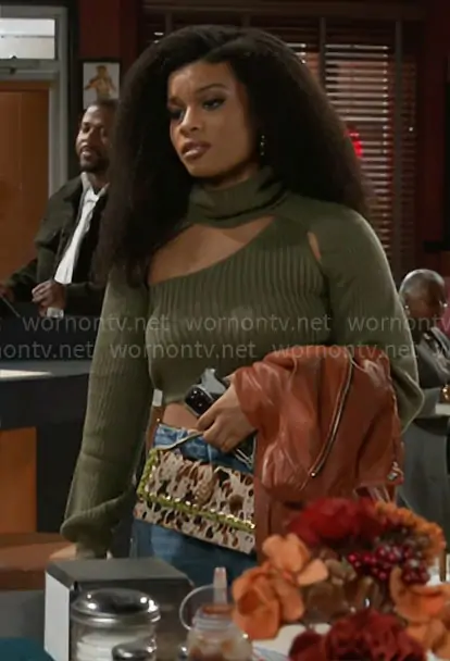 Eva Thomas (played by Ambyr Michelle) on Beyond the Gates on CBS was spotted wearing this green cropped cutout sweater and cow bag on Beyond the Gates on Nov 21 2025's episode. Eva's Sweater is the Feel It Out Turtleneck Sweater Set in Olive by Fashion Nova . Eva's Jacket is the Leather Fringe Jacket by Mauritius . Eva's Bag is the Small Bond Top Handle Cow Print Haircalf Satchel Bag by Kurt Geiger.
