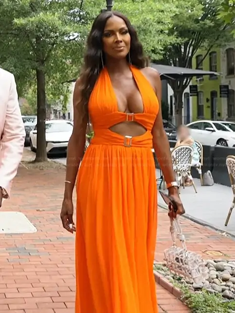 Stacey Rusch on The Real Housewives of Potomac on Bravo was spotted wearing this orange buckle cutout dress on The Real Housewives of Potomac on episode 'Pride and Pettiness' (10x08) in Nov 2025. Stacey's Dress is the x REVOLVE Jamilah Dress by Yaura.
