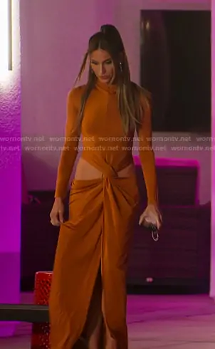 Kaylee Ricciardi (played by Kaylee Ricciardi) on Selling the OC on Netflix was spotted wearing this orange cutout maxi dress on Selling the OC on episode 'Hall's Fair in Love and War' (4x04) in Nov 2025. Kaylee's Dress is the Keri Dress by Cult Gaia.