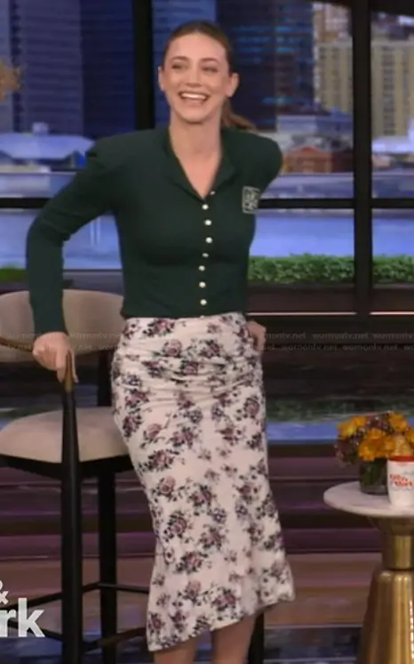 on Live with Kelly and Mark on Disney ABC Home Entertainment was spotted wearing this floral skirt on Live with Kelly and Mark on Nov 24 2025's episode. 's Sweater is the 2026 Resort Collection by Tory Burch . 's Skirt is the Printed velvet midi skirt by Tory Burch.