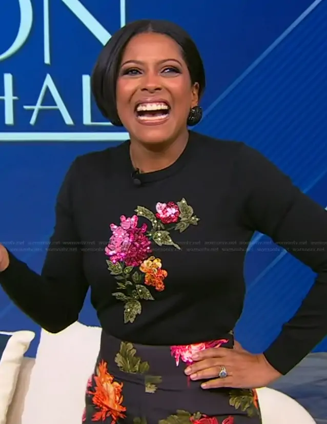 Tamron Hall on Tamron Hall Show on ABC was spotted wearing this floral sequin sweater and pants on Tamron Hall Show on Nov 24 2025's episode. Tamron's Sweater is the Floral Embroidered Silk-Cotton Crewneck Sweater by Carolina Herrera . Tamron's Pants is the Diane floral-print faille wide-leg pants by Carolina Herrera.