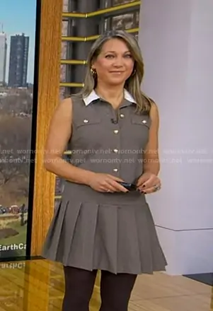 Ginger Zee on Good Morning America on ABC was spotted wearing this beige pleated mini dress on Good Morning America on Nov 24 2025's episode. Ginger's Dress is the Sleeveless Button Down Box Pleat Mini Dress by Cece.