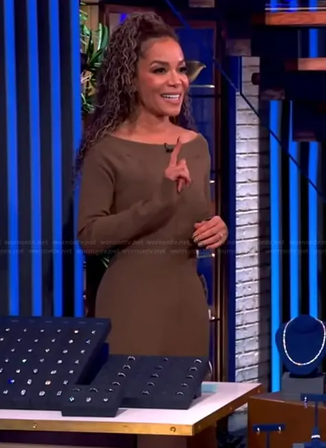 Sunny Hostin on The View on ABC was spotted wearing this brown off shoulder dress on The View on Nov 25 2025's episode. Sunny's Dress is the Romi off-the-shoulder asymmetric stretch-knit dress by Proenza Schouler.