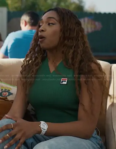 Lisa (played by Simone Joy Jones) on Bel-Air on Peacock was spotted wearing this green v-neck top on Bel-Air on episode 'Be a Kid' (4x02) in Nov 2025. Lisa's Top is the X Hailey Knit Baby Tank by Fila.