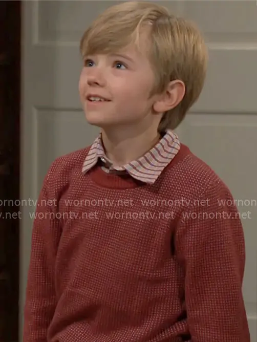 Harrison Abbott (played by Redding Munsell) on The Young and the Restless on CBS was spotted wearing this red dotted sweater on The Young and the Restless on Nov 25 2025's episode. 's Shirt is the Plaid Seersucker Twill Shirt by Janie & Jack . 's Sweater is the Birdseye Textured Sweater by Janie & Jack.