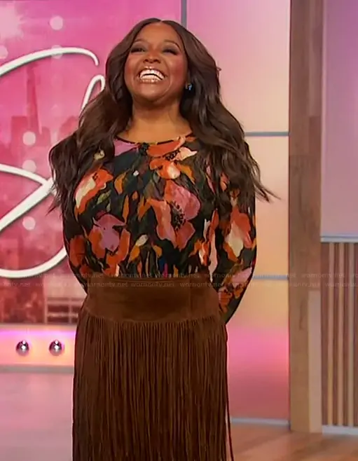 Sherri Shepherd on Sherri on FOX was spotted wearing this suede fringe skirt on Sherri on Nov 25 2025's episode. Sherri's Top is the Floral Long Sleeve Mesh Top by Ted Baker . Sherri's Skirt is the Rae Coordinating Faux Suede Fringe Midi Pencil Skirt by Antonio Melani . Sherri's Shoes is the Hints Pump by Jeffrey Campbell.