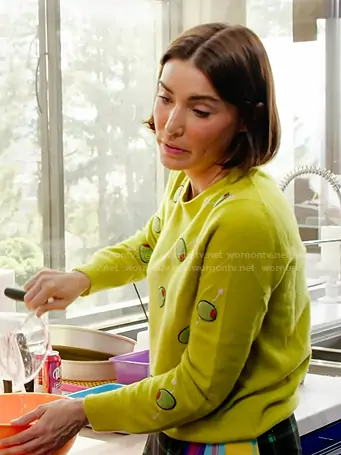 Bronwyn Newport on The Real Housewives of Salt Lake City on Bravo was spotted wearing this yellow cocktail olive sweater and plaid skirt on The Real Housewives of Salt Lake City on episode 'Ladies Who Lunch: The Sequel' (6x11) in Nov 2025. Bronwyn's Sweater is the Cocktail Olives Crewneck Cashmere Sweater by Libertine . Bronwyn's Skirt is the Semira Skirt by Alice + Olivia.