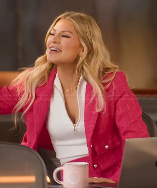 Fiona Belle (played by Fiona Belle) on Selling the OC on Netflix was spotted wearing this pink tweed jacket on Selling the OC on episode 'Seeking Arrangements' (4x06) in Nov 2025. Fiona's Jacket is the Tweed Cropped Balzer by Betsey Johnson.