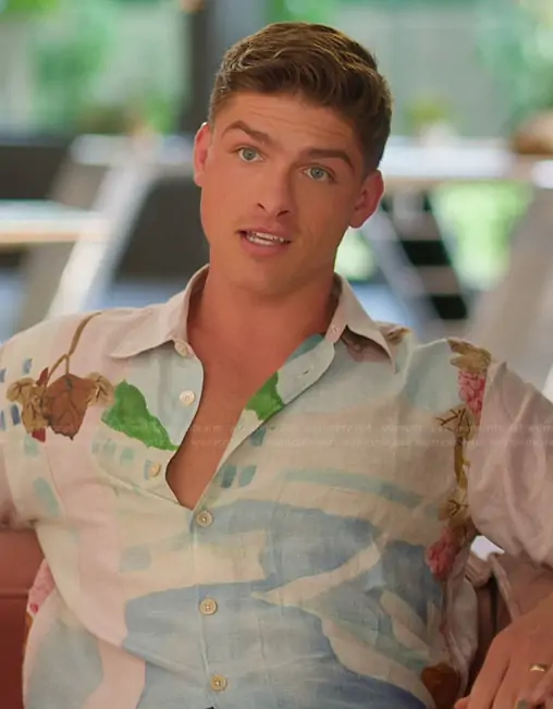 (played by ) on Selling the OC on Netflix was spotted wearing this floral confessional shirt on Selling the OC on episode 'Seeking Arrangements' (4x06) in Nov 2025. 's Shirt is the Beyond Cotton & Silk Button-Up Shirt by Our Legacy.