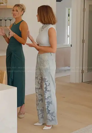 Polly Brindle (played by Polly Brindle) on Selling the OC on Netflix was spotted wearing this embroidered jeans on Selling the OC on episode 'Seeking Arrangements' (4x06) in Nov 2025. Polly's Pants is the Crystal Embroidered Raw Hem High Waist Relaxed Straight Leg Jeans by Bayeas.