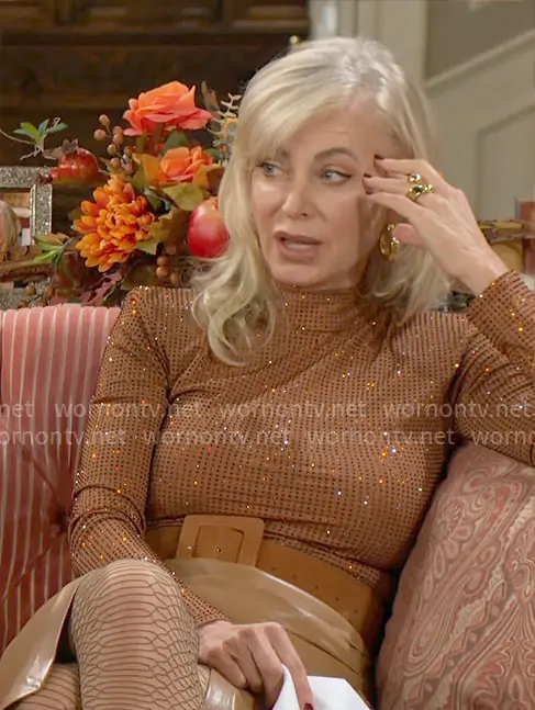 Ashley Abbott (played by Eileen Davidson) on The Young and the Restless on CBS was spotted wearing this rhinestone top and leather skirt on The Young and the Restless on Nov 26 2025's episode. Ashley's Top is the Ana Body by Mariandree Gaitan . Ashley's Skirt is the Gina Skirt in Lion by Generation Love.