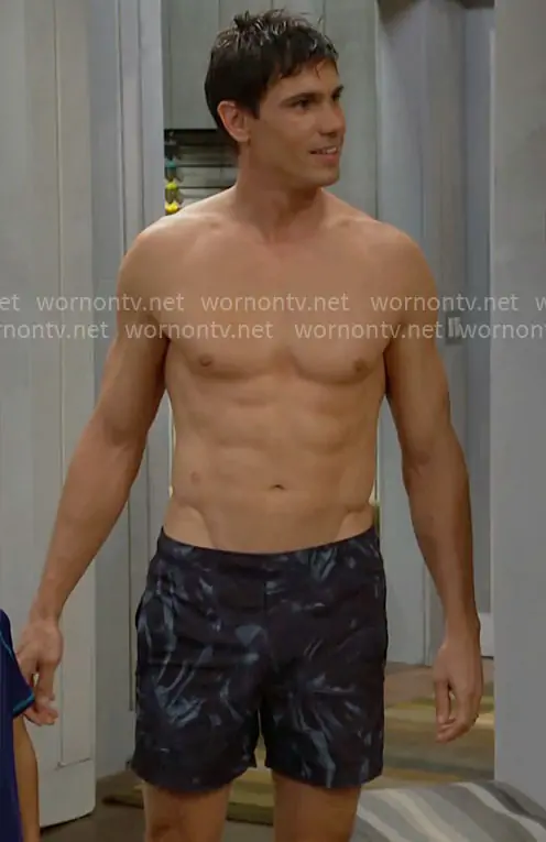 Dr. John Finnegan (played by Tanner Novlan) on The Bold and the Beautiful on CBS was spotted wearing this printed swim shorts on The Bold and the Beautiful on Nov 26 2025's episode. Finn's Shorts is the Jace Palm Print Swim Shorts by Theory .