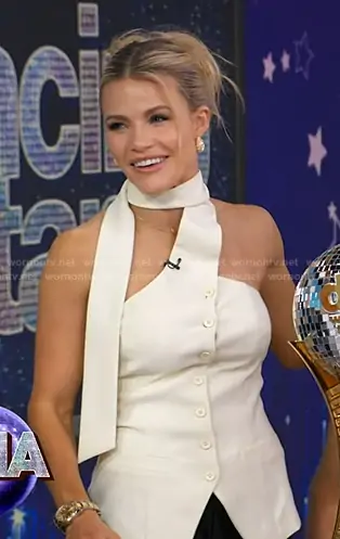 on Good Morning America on ABC was spotted wearing this white tie neck top on Good Morning America on Nov 26 2025's episode. 's Top is the Courtney Top by All The Ways.