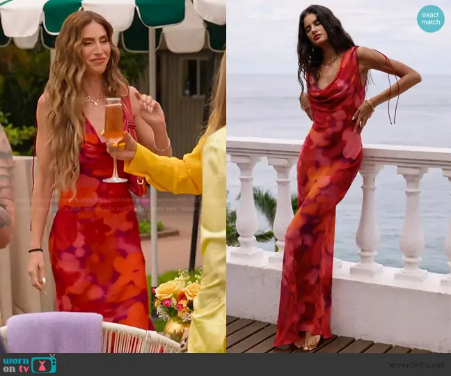 Kaylee Ricciardi (played by Kaylee Ricciardi) on Selling the OC on Netflix was spotted wearing this Kaylee red floral drape dress on Selling the OC on episode 'Secrets, Sage and Sandcastle' (4x07) in Nov 2025. Kaylee's Dress is the Andressa Dress in Floresta by Bydee.