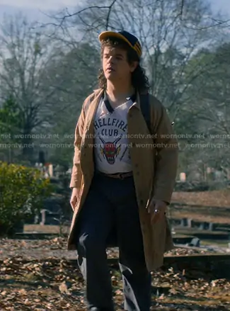 Dustin (played by Gaten Matarazzo) on Stranger Things on Netflix was spotted wearing this Dustin’s Hellfire Club tee and yellow baseball cap on Stranger Things on episode 'Chapter Three: The Turnbow Trap' (5x03) in Nov 2025. Dustin's Shirt is the Hellfire Club Raglan T-Shirt designed by Trevor Girard at Beholder . Dustin's Hat is the This item is either handmade by the costume department or vintage..