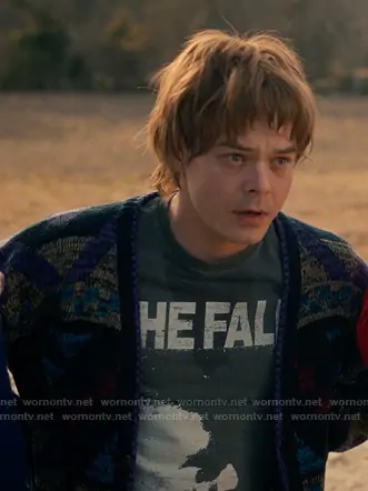 Jonathan Byers (played by Charlie Heaton) on Stranger Things on Netflix was spotted wearing this grey The Fall print tee on Stranger Things on episode 'Chapter Three: The Turnbow Trap' (5x03) in Nov 2025. 's Shirt is the Vintage Tha Fall T-Shirt . 's Jackeat is the Range Denim Sherpa Mens Jacket by Billabong x Wrangler.
