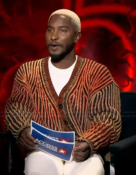 Scott Evans on Access Hollywood on NBC was spotted wearing this striped cardigan on Access Hollywood on Dec 08 2025's episode. Scott's Sweater is the Oakland Cardigan by Diesel.