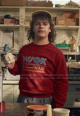 Dustin (played by Gaten Matarazzo) on Stranger Things on Netflix was spotted wearing this Dustin’s red WSQK print sweatshirt on Stranger Things on episode 'Chapter Eight: The Rightside Up' (5x08) in Jan 2026. Dustin's Shirt is the Costume gallery outfits are for display only. Items are either handmade by the costume department or vintage. . Dustin's Hat is the This item is either handmade by the costume department or vintage..