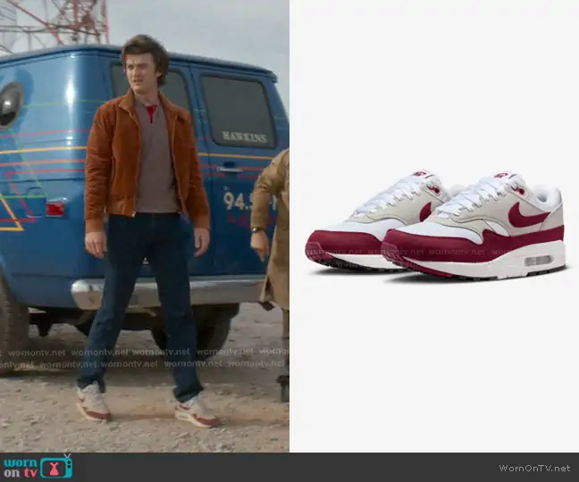Steve Harrington (played by Joe Keery) on Stranger Things on Netflix was spotted wearing this grey and burgundy sneakers on Stranger Things on episode 'Chapter One: The Crawl' (5x01) in Nov 2025. 's Shoes is the Vintage Air Max '87 Sneakers by Nike.